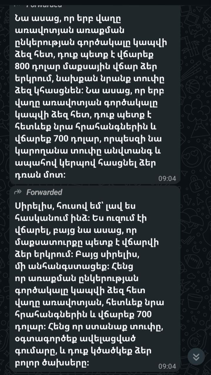 «Ասում էր՝ դա մաքսատուրքի գումարն է, որ արկղը կարողանան վերցնել օդանավակայանում ու հասցնել մինչև մեր տուն։ Ասում էր՝ ոչ ոք չգիտի դրա մասին, դա գաղտնի է։ Ասաց՝ ինքնաթիռը վաղը կժամանի, ես պիտի շուտ վճարեմ»։